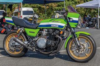 FZ~FB純正ラインをベースに置き、赤と白でアレンジしたホンダCB750F。CB-Fミーティングや第3回CB事変など、このところ安田商会が出展するイベントの同店ブースでメインに置かれてもいたものだ。車体はノーマルを測定・修正、これに安田商会オリジナルステムや同レイダウンキットによってヤマハXJR1300用足まわりをコンバートした、定番と言える17インチ仕様になっている。