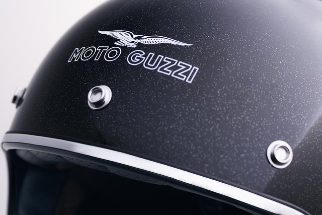 今回販売されたものは、クラシックなスタイルのジェットヘルメット。シンプルな単色の帽体に、モト・グッツィのイーグルロゴが頭頂部・後頭部にあしらわれています。