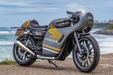 角型スイングアームやリンク式モノクロスサスもノーマル。リヤホイールは同じヤマハのR1-Zから流用することで18/17→2.75-17/3.50-17サイズとし、前後17インチ&ワイドリム化。パウダーコート処理で維持性にも配慮する。タイヤはブリヂストンTS020でラジアル化してある。
