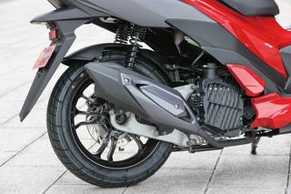 JET Xは台湾屈指のメーカー、SYMの最新モデル。サイズはPCXやNMAXより少し大きい程度。ポジションはPCXのように車体に潜り込むスタイルではなく、ライダーが上から押さえ込んで積極的に操るタイプ。ステップフロアの前側まで脚を伸ばせるから、大柄なライダーでも窮屈ではないだろう。