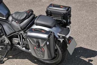 ここで装着しているのが完全防水セミハードシェルのSWモテック・SYS-BAG WP M。サイドキャリアのおかげでバッグと車体の傾き角が異なるようなこともなくてすむしバッグ単体の運び出しも容易になる。