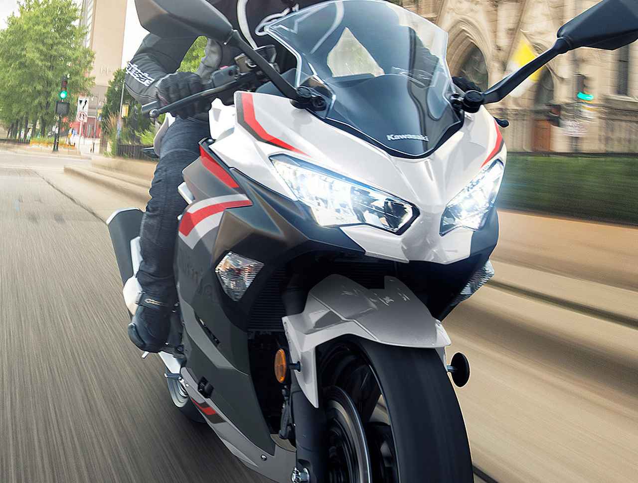 初代Ninja400Rの登場後、2度のモデルチェンジを受け2018年から現行型となったNinja400。兄弟車Ninja250と共通の軽量なトレリスフレームに、排気量398cc水冷並列2気筒エンジンを搭載しており、その車重は車重167kgとクラス屈指の軽さを誇る。