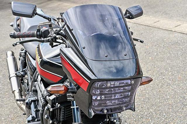 ビキニカウルはドクターSUDA製ステーでフレームマウント化しヘッドライト前にルーバーを装着しワンタッチ着脱できるカバーも備える。