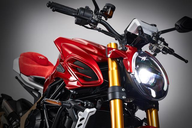 ボディカラーは専用色の「パールレッド&シルバー・アゴ」。MVアグスタのレーシングヘリテージを象徴する特別なカラーリングだ。この「ブルターレ・セリエ・オロ」は世界限定300台で、イタリア・ヴァレーゼ本社で熟練工によって組み上げられる。まさに“所有する喜び”に満ちた1台だ。