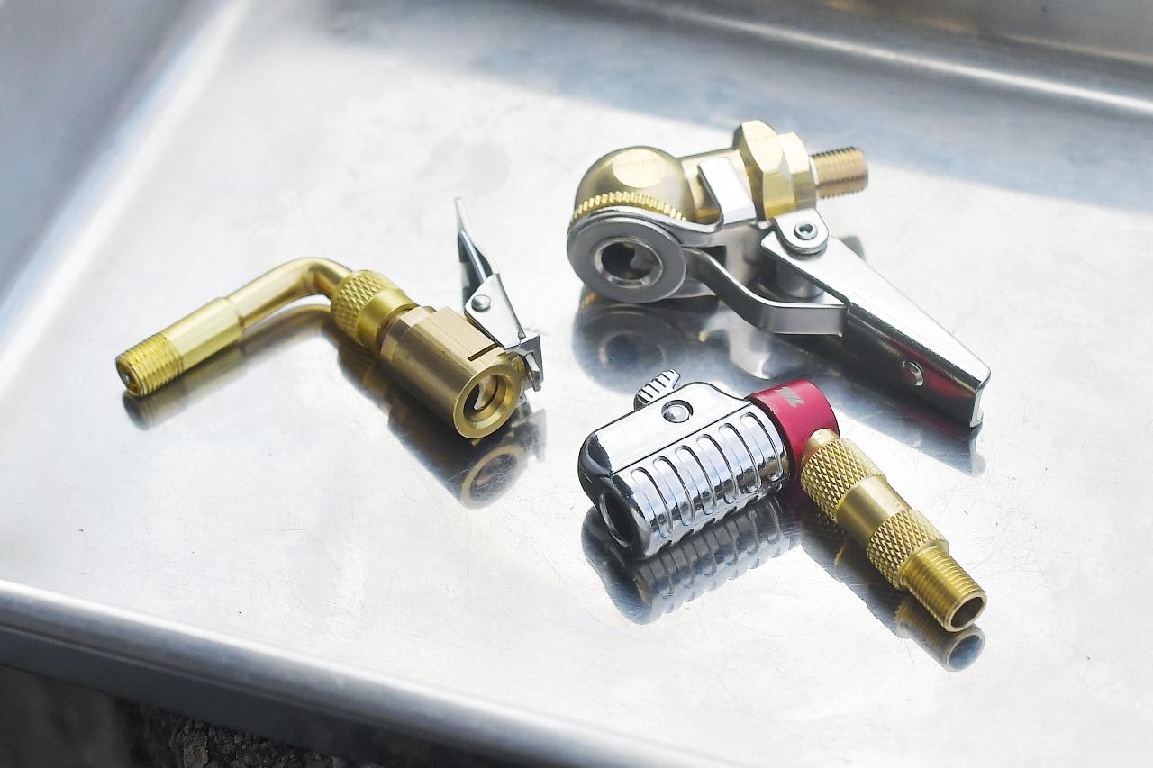 一番左が711Lというメーカーのスナップ&ロックエアチャック。真ん中はクリップチャック。そのままだと使い難そうなので、L字のジョイントパーツを装着。一番右はキジマのクイックアダプター。