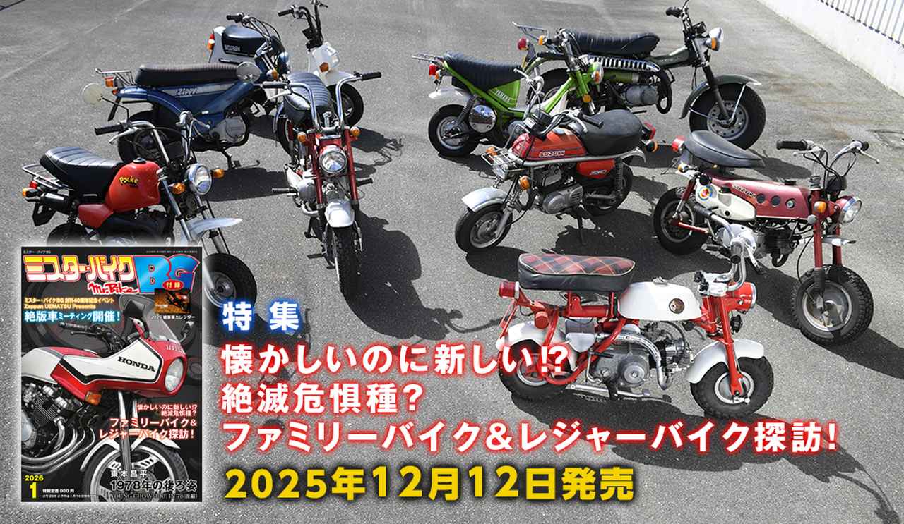 第2特集では、いつも身近にあった、70〜80年代のファミリー&レジャーバイクを紹介。絶滅危惧種とも言われる、激レアな8台も試乗インプレを決行。ファミリー&レジャーバイクに加え、個性豊なスポーツミニバイクも紹介するカタログも展開。