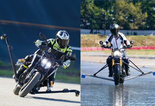 ABSの威力を体験できる状況のひとつがウェット路面。今回は転倒防止のアウトリガーを付けた状態で、ウェットを想定した路面ミューの低い、滑りやすいコースでABSを存分にテストしてみたぞ!