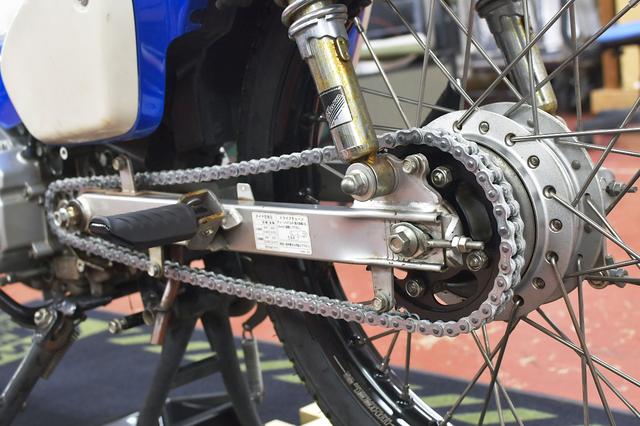 車体にタイヤが付いたら、チェーンをドライブスプロケットからドリブンスプロケットまで通そう。
