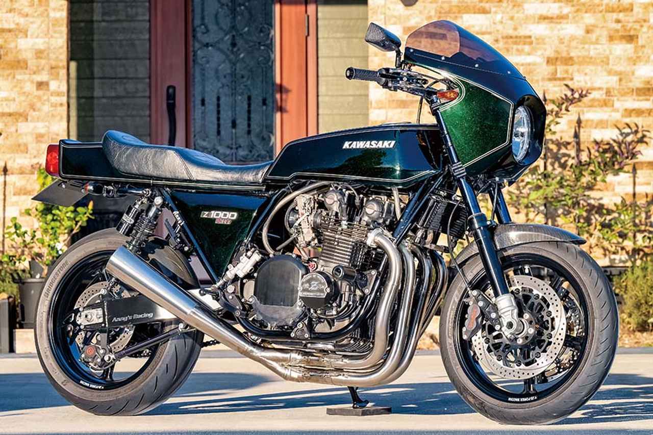 KZ1000を元にスリムな燃料タンクなど角型デザインの外装やビキニカウル、4-1メガホンマフラーを装着し、前後18インチで’77年にリリースされた“メイクス・カフェ”(メーカー製カフェレーサーモデルのこと。実際にもこう呼ばれた)Z1-R。そのスマートな印象をそのままに、現代的に洗練したと思えるこの車両。アニーズによる手が入っている。