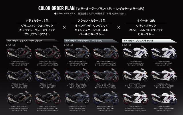 ノーマルの隼が車両本体価格:223万3000円(10%消費税込み)なのに対して、期間限定のカラーオーダープランは車両本体価格は235万4000円(10%消費税込み)なので、5万5000円プラスするだけで隼を自分色に彩ることが可能。