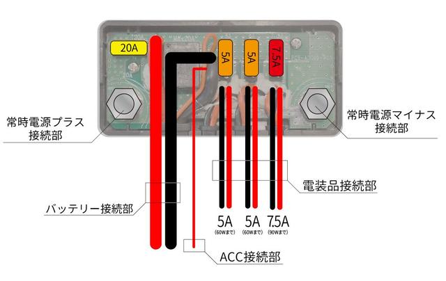 アクセサリー電源に関しては、5Aの配線2本に7.5Aの配線1本の3ポート。サイズは85×40×25mm
