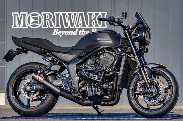マットブラックで仕立てられた外装。燃料タンク上には青×黄のモリワキラインが入る。