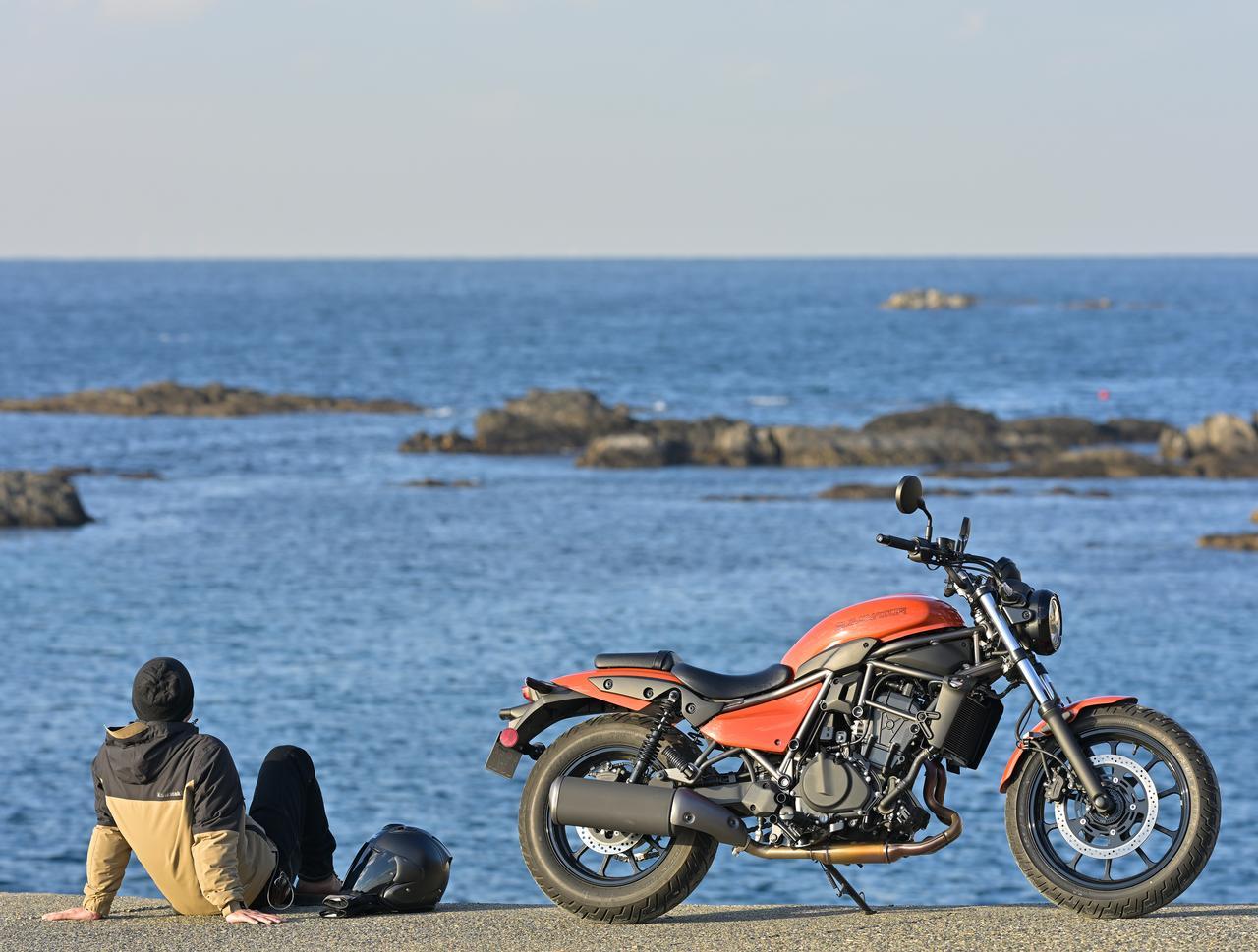 ▲ELIMINATORには海沿いの景色がよく似合う。2026年モデルの新色「パールラヴァオレンジ」の配色も鮮やかだ。愛車の写真撮影を楽しみたいライダーには、格好の被写体になるだろう。