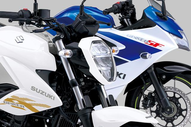 一方ジクサーSF250はセパレートハンドルとフルカウルを採用したスポーツモデル。低く構えたシルエットとワイドLEDヘッドライトにより空力とスポーティな外観を強調し、装備重量158kgの安定感ある走行性能を備える。