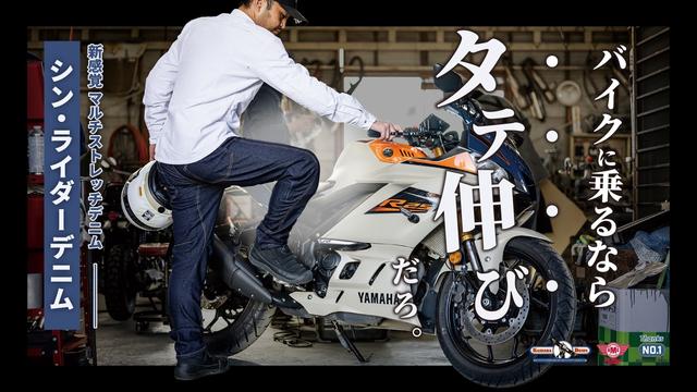 ▲「シン・ライダーデニム」の“乗りやすさ”を象徴する圧巻のタテ伸び性能