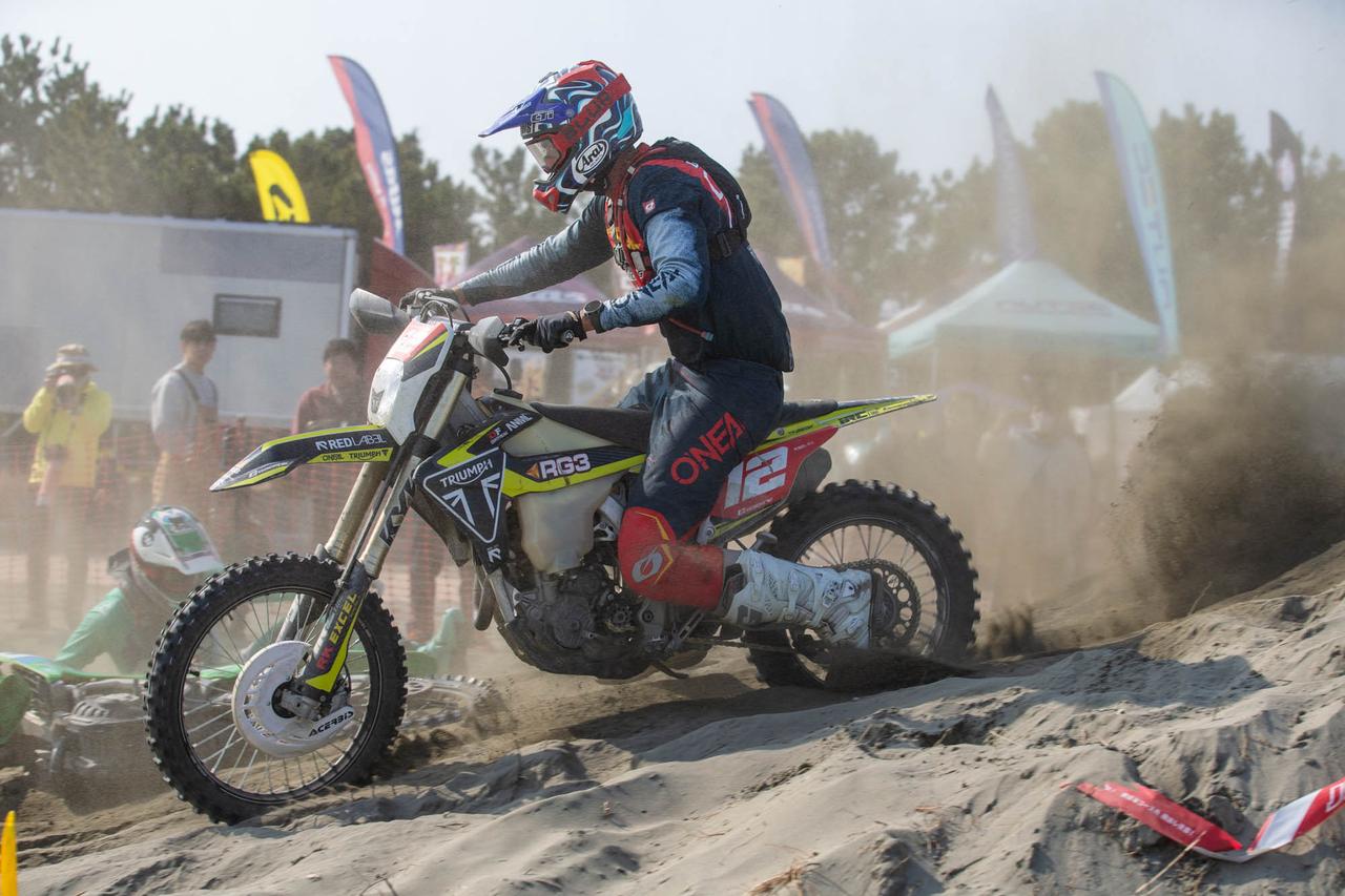 グランキストはトライアンフのTF250-Eにオーストラリアから持ち込んだGET ECU SX1によるマップを投入し、さらに吸排気系にはモトクロス用のアクラポヴィッチを合わせた。できるだけパワーを引き出そうという作戦だ。「元々TF 250-Eは、250ccのエンデューロバイクとしてはパワーもトルクもしっかりあるバイクなんだ。スタンダードでも勝負できることは知っていたけど、今回は絶対に勝ちたかったからね。第1戦で課題だったサスペンションも、RG3が一生懸命やってくれて最高の設定になったよ。IRCのM5Bもいいチョイスだったと思うよ、この徳島の海岸はサンドだけでなく半分くらい硬い路面だから、パドル系のタイヤよりもアドバンテージが高かったはずだ」