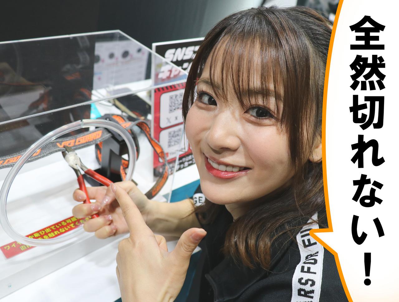 そして、モーターサイクルショーのミツバサンコーワブースでは、実際にこのベルトの強さを試すことができる体験コーナーが。早速なっちゃんに体験していただきました。