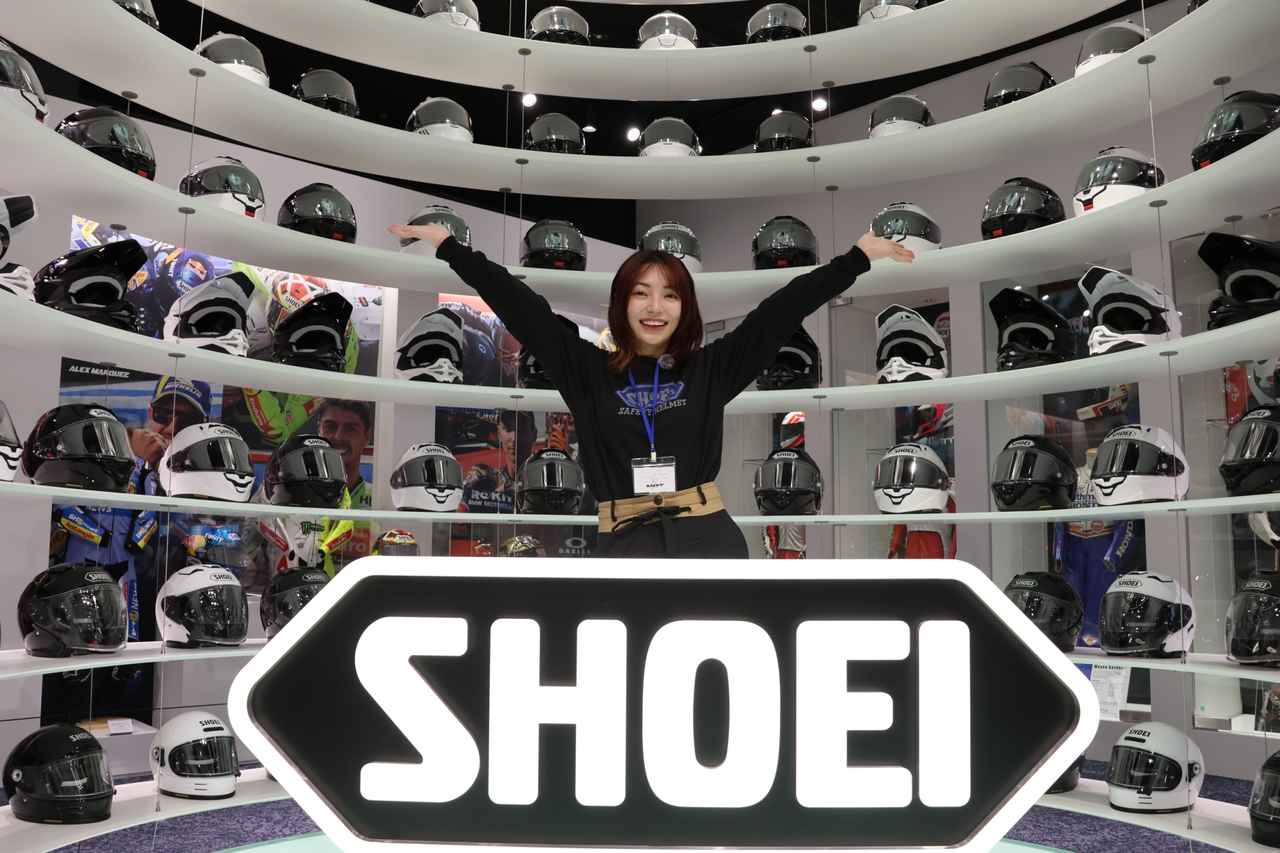 1階のSHOEI Galleryは、国内最大級の広さ。全モデルがズラリと並ぶ様は圧巻。